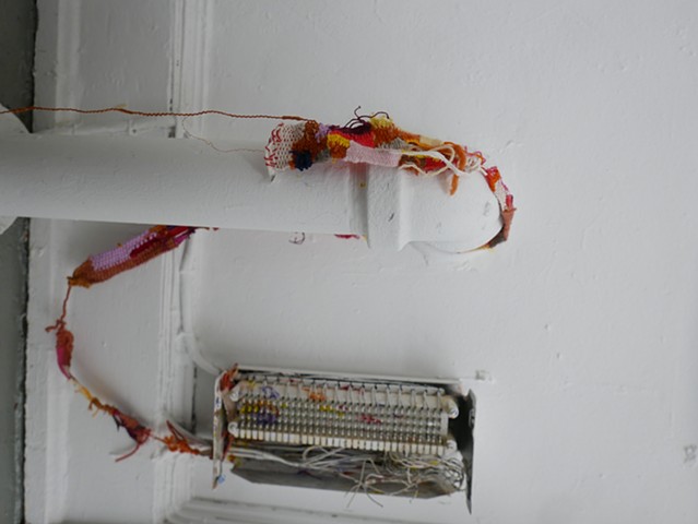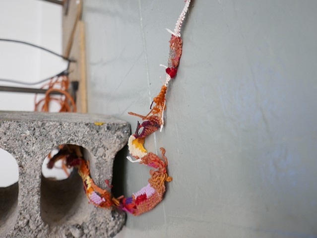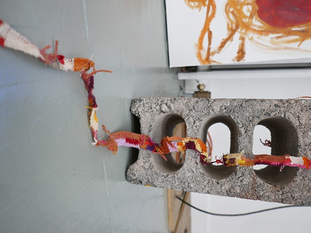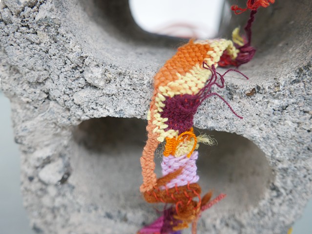 Found underpainting, found concrete brick, weavings made from unwoven sweaters, handmade paper thread (shifu), old t-shirts, other yarns, wires; woven on train rides over the course of 4 months in 2025.