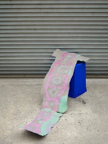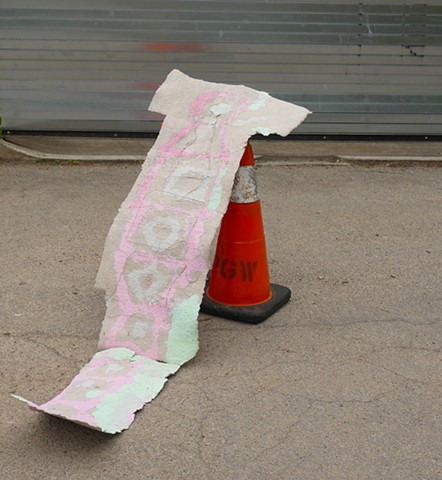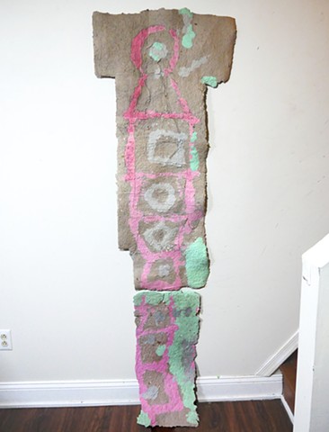 Made to be life-size with ripples reminiscent of a human body. This piece serves as a reflection on a city's "skin," and uses recycled materials to make the paper. As I think about mobility between places while drawing hopscotch patterns, I have also been seeing the rungs of a ladder, which could also be the bars of a cage.